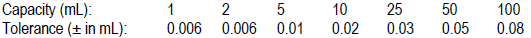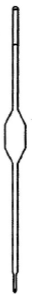 The graduated pipet is similar to the buret except that it is hand-held and is filled by putting a rubber suction bulb over the end, drawing the liquid up past the last calibration mark, then quickly placing the end of your finger over the end of the pipet to hold the vacuum. By gently rolling your fingertip aside, you can let excess liquid drain out until the meniscus reaches the mark. Practice this until you are smooth and confident at it. Then put the tip of the pipet over your receiving vessel and let the liquid drain until the desired volume is delivered. Graduated pipets come in different volumes.Volumetric Pipet