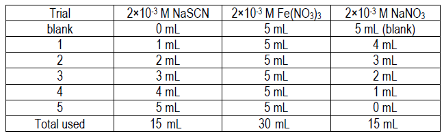 Use the solutions provided, each of which is 2 × 10–3 M: NaSCN, Fe(NO3)3, and NaNO3.