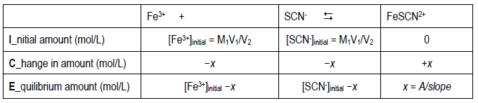 [FeSCN2+] at equilibrium is determined using Beer's Law; x is the amount of FeSCN2+ created (determined experimentally).