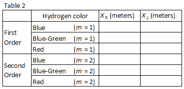 Three easily observed colors in hydrogen are listed in Table 2. Match the colors with the images seen through the diffraction grating. Record the positions XR and XL of the first order images in Table 2.