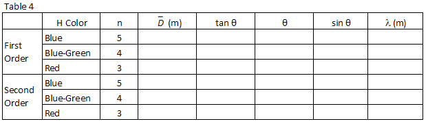 Following the same procedure used in step 1 above, find sin θ for each of the hydrogen wavelengths you observed and record them in Table 4.