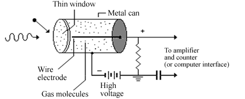 Alpha, beta, and gamma particles can ionize other atoms in their paths. This fact allows us to detect their passage electronically with a device called a Geiger tube. In a Geiger tube, an ionizing particle is passed into a cylinder of gas that has a high voltage between a central electrode and the outside. When electrons are knocked off of atoms the electrons flow toward the central electrode while the positive ions flow toward the outer wall of the cylinder. This creates a burst of current that can be amplified and sent to a computer or electronic counter (such as the Nucleus counter unit that you will use) so the passage of a particle of ionizing radiation can be recorded.