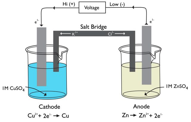 When electrons are transferred spontaneously (downhill in free energy), they can do work in an external circuit if the half-reactions are separated into different compartments. This is how batteries work. Such devices are called galvanic cells. It is also possible to set up an electrolytic cell, in which an external voltage (energy source) is used to drive a redox reaction in the nonspontaneous direction. Many industrial processes involve electrolysis. An important example is the production of aluminum metal from its ore (Al2O3). Separating half-reactions also allows one to measure the energy difference between the electrons in the donor orbitals of a reducing agent and the acceptor orbitals of an oxidizing agent. You will combine a series of redox couples and measure the energy differences between them. This is typically performed in an electrochemical cell. One is shown in Figure 2 below.