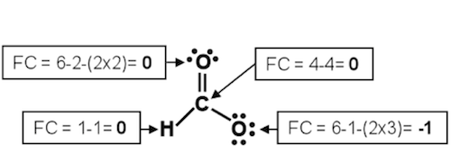 below. Note how the sum of the formal charges (0 + 0 + 0 + –1) adds up to the –1 charge on the formate ion.