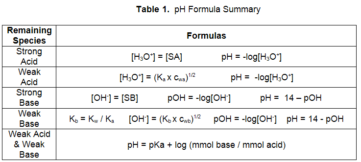 can be calculated from the final mmol/(total volume) to give 2.0 mmol/(10 + 15 mL) = 0.08 M. Table 1 contains the necessary formulas to calculate pOH and pH from this information. The pH of this mixture is 12.90.