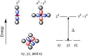 As shown in Figure 14.2, the metal-ligand bonds in an octahedral coordination form the coordinate system for the d-orbitals. Thus, the z2 and x2-y2 orbitals are directed along the axis of the metal-ligand bonds as they are directed along the z and the x and y axes, respectively.