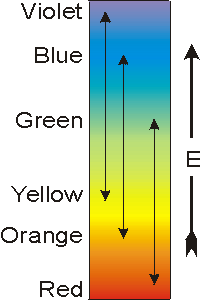 Recall from Section 2.2 that the energy of a photon (bundle of light energy) is proportional to its frequency: where h is Planck's constant (6.63 × 10–34 J/s) and ν is the frequency of the photon in s–1. Thus, the energy of visible photons increases in the order red < orange < yellow < green < blue < violet. Substances that are colored absorb photons in the visible region of the electromagnetic spectrum to promote an electron from one orbital to another that is higher in energy. The energy difference between the two orbitals (ΔE) can be determined from the frequency of the light that is absorbed by the following relationship: