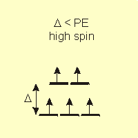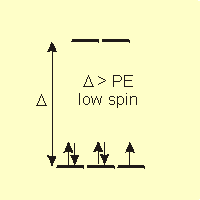 •low spin: If Δ > PE, the electrons pair before entering the higher energy set. This is most common when strong field ligands are present.