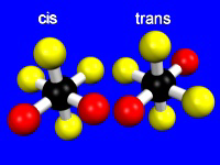 Two cis ligands (red spheres) are adjacent to one another, while two trans ligands are opposite one another.