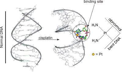 Cisplatin binds to DNA, which causes a shape modification in the DNA that hinders its function.