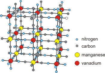 The structure of Cs2Mn[V(CN)6], which is a ferrimagnet in which the spins of the vanadium and manganese atoms are opposed, is shown in Figure 14.21. However, the vanadium atoms (red spheres), which are in the +2 oxidation state, have three unpaired electrons (S = 3/2), while the manganese atoms (yellow spheres), which are also in the +2 oxidation state, have five unpaired electrons (S = 5/2). Since the spin on Mn is almost twice that on V, a net magnetic field is produced even though the two spins oppose one another.