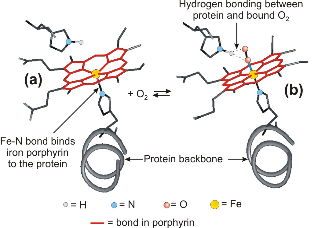 Oxygen transport is carried out by binding O2 to iron in a heme group.