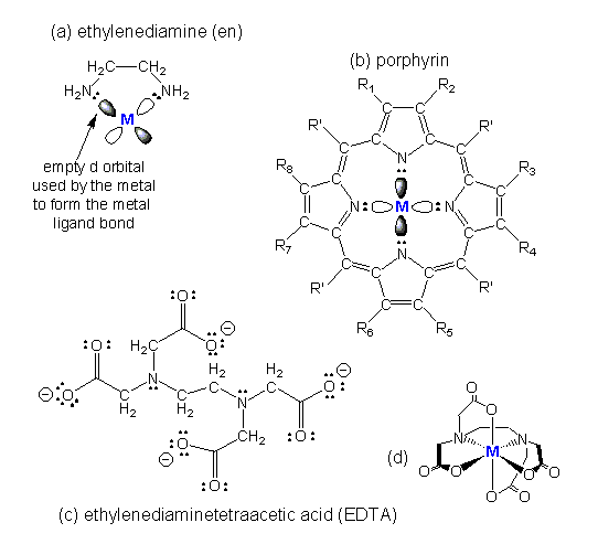 Transition metals are frequently found in complexes, substances in which the metal is bound to several molecules and/or ions. The molecules or ions that bind to a metal are called ligands. Ligands have lone pairs and function as Lewis bases, while metal ions have empty orbitals that can be used to share the lone pair; i.e., metals are Lewis acids. Although most ligands use only one lone pair to bond to a metal, some ligands can use more than one. If such ligands bond to two different metals, they are called bridging ligands, because they form a bridge between the two metals. If more than one lone pair from a ligand binds to the same metal, the ligand is said to be a chelating ligand.