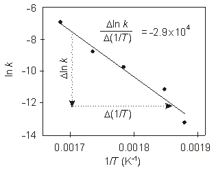 E =240_0_2_Ideally, a least squares fit of the data should be done to obtain the best slope. The least square squares result is shown in the figure to be –2.9e+04 K. However, if you do not have that capability on your calculator, use two data points that best describe the slope of the best line to obtain the slope. In this problem, we will use the first and third points.