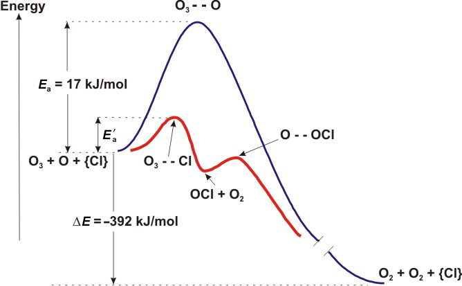 Energy diagram for the reaction O3(g) + O(g) → 2 O2(g) (a) in the absence and (b) in the presence of catalytic chlorine atoms (blue curve). The activation energy
