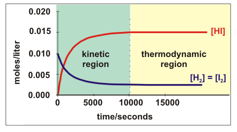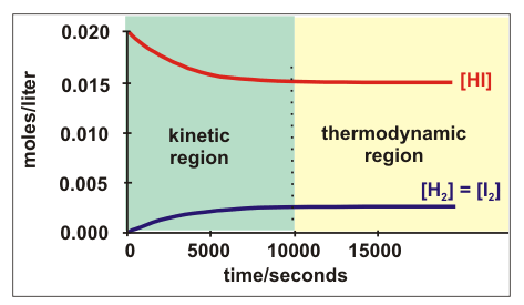 It takes time for the concentrations of reactants and products to change from their initial to their equilibrium values, but once equilibrium is established, the concentrations no longer change. Kinetics studies the reaction during the time of change, while thermodynamics is concerned only with the initial and equilibrium conditions. Thus, the region of time in which the concentrations are changing is called the kinetic region, while the region after equilibrium is established is called the thermodynamic region.Consider the decomposition of 0.020 M HI at 700 °C, 2 HI(g) → H2(g) + I2(g). The concentrations of both reactants and products are shown in Figure 10.1a as a function of time in seconds. The concentration of HI decreases for about 10,000 seconds (about three hours) and then levels off at 0.015 M. During that time, the concentrations of H2 and I2 each rise from zero to about 0.0025 M. Once the concentrations are no longer changing, the system has reached equilibrium. Thus, approximately three hours are required to obtain an equilibrium mixture at this temperature. Δng = 0 for the reaction, so the thermodynamic equilibrium constant for the reaction is equal to Kc, so it can be determined from the equilibrium concentrations,