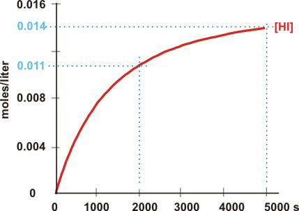 Consider the following three points in the plot of HI concentration versus time at 700 °C for the reaction H2 + I2→ 2 HI shown in Figure 10.2.