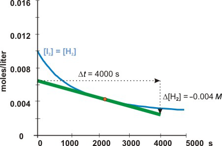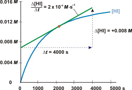 It is not the average rate of change that is important in kinetics studies. Rather it is the instantaneous rate of change; i.e., the rate at which the concentration is changing at a given time. The instantaneous rate at a given time is given by the slope of the tangent to the concentration versus time curve at that instant. We will assume that anytime a rate is given, that it is the instantaneous rate unless it is specified to be the average rate.We now determine the rate of formation of HI 2130 s into the reaction. Consider the graph shown in Figure 10.3, which shows the variation of the HI concentration with time in more detail than in Figure 10.1a. The rate of formation of HI at this point equals the slope of the tangent (shown as a green line). The slope is determined by taking two points on the tangent line and determining the change in concentration by the time interval between the two points. We use the two points at the ends of the line to determine the slope and therefore the rate of formation at that time as follows.