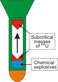 Chemical explosive (TNT) is used to drive one subcritical mass into another. If the sum of the two subcritical masses exceeds the critical mass, an uncontrolled chain reaction is initiated.