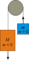 Consider Figure 3.1, in which a larger mass M is attached to a smaller mass m through a pulley. Upon release, the larger mass would drop and its potential energy would decrease, but as it falls, it exerts a force on the other mass causing it to move up. Work, w, is defined as a force through a distance, so the larger mass does work on the smaller one. For this discussion, we assume that 50 J of work is done. By convention, w is defined as the work done on the system. So we would deduce that w = –50 J if the larger mass is the system, but w = +50 J if the smaller mass is the system. The sign of w is given conversationally by using "on" or "by" as follows:-