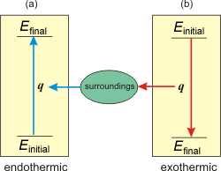 (a) Endothermic process: q > 0 and heat flows from the surroundings into the system. (b) Exothermic process: q < 0 and heat flows from the system into the surroundings.