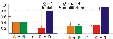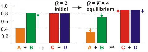 The equilibrium constant was defined in Chapter 4, and calculations were done to establish the relationship between it and the standard free energy change of the reaction. However, the equilibrium constant is most valuable because it lets us predict the composition of an equilibrium mixture or to adjust the reactant concentrations so as to obtain an equilibrium mixture with the desired composition. These calculations are so important that they form the basis of this chapter and much of Chapters 6, 7, and 8, where the principles established in this chapter are applied to proton transfer, solubility, and electron transfer processes, respectively.5.1 The Equilibrium Constant