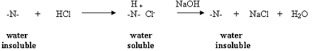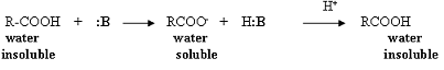 Acetylsalicylic acid, Aspirin, is an organic acid; therefore, it is soluble in an organic solvent (diethyl ether), but will react with a basic reagent (:B) such as sodium hydroxide or sodium bicarbonate to produce the conjugate base of the acid. The conjugate base is a salt and is water soluble; therefore, it is removed from the organic solvent layer. Reacidification of this basic aqueous layer will regenerate the organic acid, which will precipitate from the aqueous solution due to the acid's limited solubility in water.