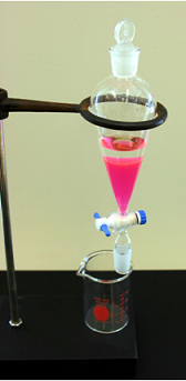 Place the separatory funnel in an iron ring on a ring stand and remove the stopper immediately.