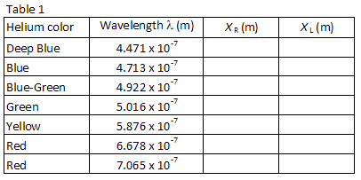 until the pointer is in line with the image being measured. The partner with the pointer then reads the position along the meter stick. Use a low-wattage reading lamp if necessary to read the meter stick. Record the position XR of each of the helium lines in Table 1.