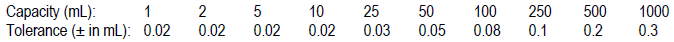 The graduated pipet is similar to the buret except that it is hand-held and is filled by putting a rubber suction bulb over the end, drawing the liquid up past the last calibration mark, then quickly placing the end of your finger over the end of the pipet to hold the vacuum. By gently rolling your fingertip aside, you can let excess liquid drain out until the meniscus reaches the mark. Practice this until you are smooth and confident at it. Then put the tip of the pipet over your receiving vessel and let the liquid drain until the desired volume is delivered. Graduated pipets come in different volumes.Volumetric Pipet