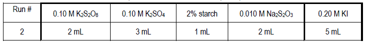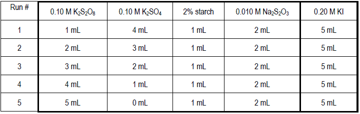 There are five runs in this series. The following table gives the volumes of reagents that must be accurately pipetted into a clean, dry 150-mL beaker for each trial.1