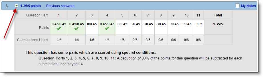 Click the + sign after the question number to determine whether a penalty is being applied based on the number of submissions.