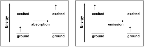Electrons in atoms, molecules, and ions ordinarily occupy the lowest energy orbitals that are available to them. This lowest energy configuration is called the ground state. However, when the atom, molecule or ion absorbs energy, one of its electrons can be promoted from a low energy orbital into a higher energy orbital and produce what is called an excited state. Atoms, molecules and ions can absorb or emit energy in the form of heat, electricity or light. During absorption, an electron is promoted from the ground to the excited state. During emission, an electron goes from the excited to the ground state.