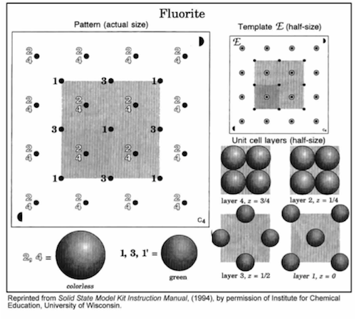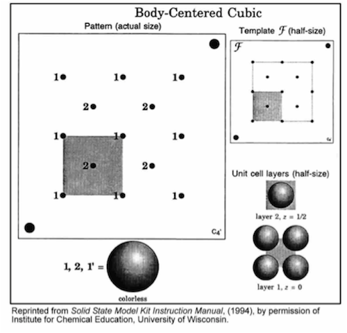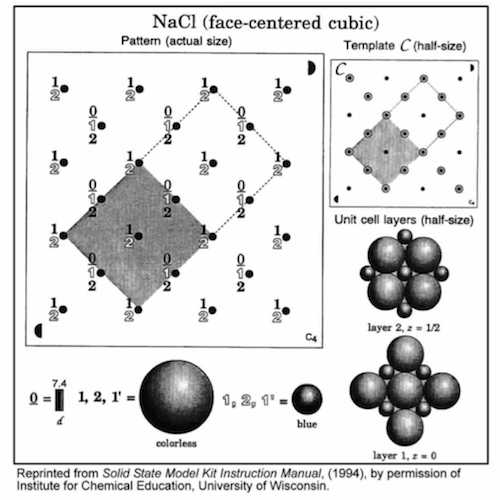 This model kit was developed by the Institute for Chemical Education at the University of Wisconsin - Madison. The instruction pages that follow are reprinted with permission from the Institute for Chemical Education (ICE), John W. Moore, director. The Chemistry Department of North Carolina State University wishes to express thanks to ICE for permission to reproduce these pages. Contents of the model kit. When you open the model kit, you will notice a series of boxes and/or bags containing different colored spheres. These will be our atoms and ions. There are also two square plastic blocks with holes drilled in them. These will be the bases. Notice that one has a circular sticker and the other a semicircular sticker. There are also a number of square paper templates with holes punched in them. Each has either a circle or semicircle in the corner and a letter to identify it. There is also a long plastic tube with metal rods in it. Assembling the structure base. Instructions for assembling each solid state base appear on the ensuing pages. In each case, a paper template is placed on top of one of the bases, with the circle or semicircle aligned. The metal rods are then inserted into specific holes in the template, as instructed. The structure is then built up, layer by layer. Taking a model apart. To take a model apart, invert the structure and allow the spheres to slowly slide off the rods. Try to make sure the spheres do not roll away. Remove the rods by grasping near the base and pulling without bending or wiggling. Instructions for assembling the solid state structures. Instructions for each of the structures in this lab are given on the ensuing pages. For each structure, pictures are reproduced from the instruction manual that accompanies the model kits. They include a picture of the template in the upper right hand corner and the pattern of holes that are used on that template in the upper left hand corner. Next to each hole in the pattern is a number, which corresponds to a layer of atoms. Building the layers in numerical order forms structures. Usually the top layer of the structure is a repeat of layer number 1, and is referred to as layer 1'. You will notice that some of the numbers are black and others are white. The black and white numbers correspond to different color spheres, as given by the key at the bottom left corner. This experiment will be using the colorless, green and blue spheres. There is also a picture of the "unit cell layers". This shows a picture of the arrangement of each layer of the unit cell. Use the instructions provided to assemble each structure using the entire shaded area of the template. Do not build your structures based on the "unit cell layers", because it will not give a large enough portion of the structure to allow you to answer the questions for the non-cubic cells. Follow the typed instructions for each structure. These will give you step by step instructions on building the models. Also, you will be asked to view the structures as you assemble them and answer questions about them.Reagents