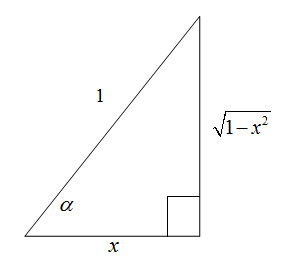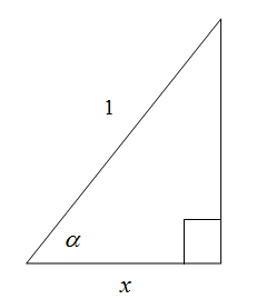 As you are about to learn the derivatives for the inverse trig functions, it is important to discuss how these types of problems change when you are given an arbitrary angle, x. So, what does the expression $\cos^{-1}(x)$ mean? We need to find the angle that has a cosine of x. This is easiest to understand if we think of a picture of a right triangle and use right triangle trigonometry. Let's label the angle in question, $\alpha$. Since $\cos(\alpha) = x$, then the picture can be labeled as in Figure 5.2. Then using the Pythagorean Theorem, we can determine the side opposite the angle $\alpha$ as in Figure 5.3.