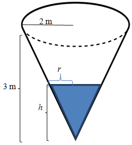 Since we are given the rate at which the water flows into the tank, we realize that we need to use the volume of the cone. From our earlier information, we know that the volume of a cone is given by the formula, $V = \frac{1}{3}\pi r^2h$. By reading the problem, we know that we need to find out how fast the height (altitude) is changing at a specific moment. One thing to observe is that as the water level rises the radius of the circle found at the top of the water level will also change. So it appears that we have too many unknown variables in the related rate problem.