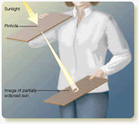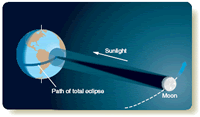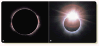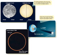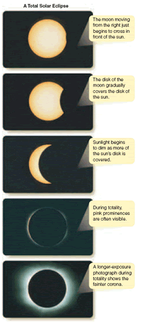 To solve for angular diameter, you can multiply both sides by 206,265 and find that the angular diameter is 1870 seconds of arc. If you divide by 60, you get 31 minutes of arc or, dividing by 60 again, about 0.5°. The moon’s orbit is slightly elliptical, so it can sometimes look a bit larger or smaller, but its angular diameter is always close to 0.5°. You can repeat this calculation for the angular diameter of the sun. The sun is 1.39 X 10 6 km in linear diameter and 1.50 X 10 8 km from Earth. If you put these numbers into the small-angle formula, you will discover that the sun has an angular diameter of 1900 seconds of arc, which is 32 minutes of arc or about 0.5°. Earth’s orbit is slightly elliptical, and consequently the sun can sometimes look slightly larger or smaller, but it, like the moon, is always close to 0.5° in angular diameter. By fantastic good luck, you live on a planet with a moon that is almost exactly the same angular diameter as your sun. When the moon passes in front of the sun, it is almost exactly the right size to block the brilliant surface of the sun. Then you see the most exciting sight in astronomy—a total solar eclipse. There are few other worlds where this can happen, because the angular diameters of the sun and a moon rarely match so closely. To see this beautiful sight, all you have to do is arrange to be in the moon’s shadow when the moon crosses in front of the sun. That means you have to chase the moon’s shadow wherever it sweeps over Earth’s surface. The Moon’s ShadowLike Earth’s shadow, the moon’s shadow consists of a central umbra of total shadow and a penumbra of partial shadow. What you see when the moon crosses in front of the sun depends on where you are in the moon’s shadow. The moon’s umbral shadow produces a spot of darkness roughly 269 km (167 mi) in diameter on Earth’s surface (Figure 3-7). (The exact size of the umbral shadow depends on the location of the moon in its elliptical orbit and the angle at which the shadow strikes Earth.) If you are in this spot of total shadow, you see a total solar eclipse. If you are just outside the umbral shadow but in the penumbra, you see part of the sun peeking around the moon, and the eclipse is partial. Of course, if you are outside the penumbra, you see no eclipse at all. Because of the orbital motion of the moon, its shadow sweeps across Earth at speeds of at least 1700 km/h (1060 mph). To be sure of seeing a total solar eclipse, you must select an appropriate eclipse (Table 3-2), plan far in advance, travel to the right place on Earth, and place yourself in the path of totality, the path swept out by the umbral spot. A total solar eclipse begins when you first see the edge of the moon encroaching on the sun’s disk. This is the moment when the edge of the penumbra sweeps over your location. During the partial phase, part of the sun remains visible, and it is hazardous to look at the eclipse without protection. Dense filters and exposed film do not necessarily provide protection, because some filters do not block the invisible heat radiation (infrared) that can burn the retina of your eyes. This has led officials to warn the public not to look at solar eclipses and has even frightened some people into locking themselves and their children into windowless rooms during eclipses. In fact, the sun is a bit less dangerous than usual during an eclipse because part of the brilliant surface is covered by the moon. But an eclipse is dangerous in that it can tempt people to look at the sun directly and burn their eyes. The safest and simplest way to observe the partial phases of a solar eclipse is to use pinhole projection. Poke a small pinhole in a sheet of cardboard. Hold the sheet with the hole in sunlight and allow light to pass through the hole to a second sheet of cardboard (Figure 3-8). On a day when there is no eclipse, the result is a small, round spot of light that is an image of the sun. During the partial phases of a solar eclipse, the image shows the dark silhouette of the moon obscuring part of the sun. These pinhole images of the partially eclipsed sun can also be seen in the shadows under trees as sunlight peeks through the tiny openings between the leaves and branches. This can produce an eerie effect just before totality as the remaining sliver of sun produces thin crescents of light on the ground under trees. Throughout the partial phases of a solar eclipse, the moon gradually covers the bright disk of the sun (Figure 3-9). Totality begins as the last sliver of the sun’s bright surface disappears behind the moon. This is the moment when the edge of the umbra sweeps over your location. So long as any of the sun is visible, the countryside is bright; but, as the last of the sun disappears, dark falls in a few seconds. Automatic streetlights come on, car drivers switch on their headlights, and birds go to roost. The darkness of totality depends on a number of factors, including the weather at the observing site, but it is usually dark enough to make it difficult to read the settings on cameras. The totally eclipsed sun is a spectacular sight. With the moon covering the bright disk of the sun, called the photosphere, you can see the sun’s faint outer atmosphere, the corona, glowing with a pale, white light so faint you can safely look at it directly. This corona is made of low-density, hot gas, which is given a wispy appearance by the solar magnetic field, as shown in the last frame of Figure 3-9. Also visible just above the photosphere is a thin layer of bright gas called the chromosphere. The chromosphere is often marked by eruptions on the solar surface called prominences (Figure 3-10a), which glow with a clear, pink color due to the high temperature of the gases involved. The small-angle formula reveals that a large prominence is about 3.5 times the diameter of Earth. Totality cannot last longer than 7.5 minutes under any circumstances, and the average is onl