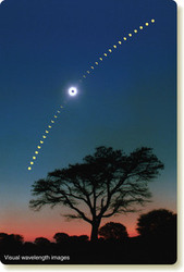 To solve for angular diameter, you can multiply both sides by 206,265 and find that the angular diameter is 1870 seconds of arc. If you divide by 60, you get 31 minutes of arc or, dividing by 60 again, about 0.5°. The moon’s orbit is slightly elliptical, so it can sometimes look a bit larger or smaller, but its angular diameter is always close to 0.5°. It is a Common Misconception that the moon is larger when it is on the horizon. Certainly the rising full moon looks big when you see it on the horizon, but that is an optical illusion. In reality, the moon is the same size on the horizon as when it is high overhead. You can repeat this small-angle calculation for the angular diameter of the sun. The sun is 1.39 × 106 km in linear diameter and 1.50 × 108 km from Earth. If you put these numbers into the small-angle formula, you will discover that the sun has an angular diameter of 1900 seconds of arc, which is 32 minutes of arc or about 0.5°. Earth’s orbit is slightly elliptical, and consequently the sun can sometimes look slightly larger or smaller, but it, like the moon, is always close to 0.5° in angular diameter. By fantastic good luck, you live on a planet with a moon that is almost exactly the same angular diameter as your sun. When the moon passes in front of the sun, it is almost exactly the right size to cover the brilliant surface of the sun. The Moon’s ShadowTo see a solar eclipse, you have to be in the moon’s shadow. Like Earth’s shadow, the moon’s shadow consists of a central umbra of total shadow and a penumbra of partial shadow. What you see when the moon crosses in front of the sun depends on where you are in the moon’s shadow. The moon’s umbral shadow produces a spot of darkness roughly 269 km (167 mi) in diameter on Earth’s surface. (The exact size of the umbral shadow depends on the location of the moon in its elliptical orbit and the angle at which the shadow strikes Earth.) If you are in this spot of total shadow, the sun’s bright surface is completely covered, and you see a total solar eclipse. Total solar eclipses are rare as seen from any one place. If you stay in one city, you will see a total solar eclipse about once in 360 years. If you are just outside the umbral shadow but in the penumbra, you see part of the sun peeking around the moon, and you see a partial eclipse. A total solar eclipse and a partial solar eclipse can be the same event seen from slightly different locations on Earth. Of course, if you are outside the penumbra of the moon’s shadow, you see no eclipse at all. Because of the orbital motion of the moon, its shadow sweeps across Earth at speeds of at least 1700 km/h (1060 mph) (Figure 3-8). To be sure of seeing a total solar eclipse, you must select an appropriate eclipse (Table 3-2), plan far in advance, travel to the right place on Earth, and place yourself in the path of totality, the path swept out by the umbral spot. Sometimes when the moon crosses in front of the sun, its angular diameter is too small to fully cover the sun’s bright surface. That can happen because the orbit of the moon is slightly elliptical, and its distance from Earth varies. When the moon is at perigee, its closest point to Earth, the moon is almost 12 percent larger in angular diameter than when it is at apogee, its most distant point from Earth. Also, because Earth’s orbit around the sun is very slightly elliptical, the sun’s angular diameter can vary by a total of about 3.4 percent. If a solar eclipse occurs when the moon’s angular diameter is too small, you would see an annular eclipse, a solar eclipse in which a ring (or annulus) of light is visible around the disk of the moon (Figure 3-9). An annular eclipse swept across the United States on May 10, 1994. Features of Solar EclipsesA solar eclipse begins when you first see the edge of the moon encroaching on the sun. This is the moment when the edge of the penumbra sweeps over your location. During the partial phases of a solar eclipse, the moon gradually covers the bright disk of the sun (Figure 3-10). Totality begins as the last sliver of the sun’s bright surface disappears behind the moon. This is the moment when the edge of the umbra sweeps over your location. So long as any of the sun is visible, the countryside is bright; but, as the last of the sun disappears, dark falls in a few seconds. Automatic streetlights come on, car drivers switch on their headlights, and birds go to roost. The darkness of totality depends on a number of factors, including the weather at the observing site, but it is usually dark enough to make it difficult to read the settings on cameras. The totally eclipsed sun is a spectacular sight. With the moon covering the bright surface of the sun, called the photosphere,3 you can see the sun’s faint outer atmosphere, the corona, glowing with a pale, white light so faint you can safely look at it directly. The corona is made of hot, low-density gas, which is given a wispy appearance by the solar magnetic field, as shown in the last frame of Figure 3-10. Also visible just above the photosphere is a thin layer of bright gas called the chromosphere. The chromosphere is often marked by eruptions on the solar surface called prominences (Figure 3-11a), which glow with a clear, pink color due to the high temperature of the gases involved. The small-angle formula reveals that a large prominence is about 3.5 times the diameter of Earth. Totality cannot last longer than 7.5 minutes under any circumstances, and the average is only 2 to 3 minutes. Totality ends when the sun’s bright surface reappears at the trailing edge of the moon. Daylight returns quickly, and the corona and chromosphere vanish. This corresponds to the moment when the trailing edge of the moon’s umbra sweeps over the observer. Just as totality begins or ends, a small part of the photosphere can peek out from behind the moon through a valley at the edge of the lunar disk. Although it is inten