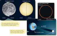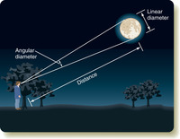 FOR EONS, CULTURES WORLDWIDE HAVE UNDERSTOOD that the sun is the source of life, so you can imagine the panic people felt at the fearsome sight of the sun gradually disappearing in the middle of the day. Many imagined that the sun was being devoured by a monster (Figure 3-5). Modern scientists must use their imaginations to visualize how nature works, but with a key difference (How Do We Know? 3-1). You can take comfort that today’s astronomers explain solar eclipses without imagining celestial monsters. A solar eclipse occurs when the moon moves between Earth and the sun. If the moon covers the disk of the sun completely, you see a spectacular total solar eclipse (Figure 3-6). If, from your location, the moon covers only part of the sun, you see a less dramatic partial solar eclipse. During a particular solar eclipse, people in one place on Earth may see a total eclipse, while people only a few hundred kilometers away see a partial eclipse. The Angular Diameter of the Sun and MoonSolar eclipses are spectacular because Earth’s moon happens to have nearly the same angular diameter as the sun, so it can cover the sun almost exactly. You learned about the angular diameter of an object in Chapter 2; now you need to think carefully about how the size and distance of an object like the moon determine its angular diameter. This is the key to understanding solar eclipses. Linear diameter is simply the distance between an object’s opposite sides. You use linear diameter when you order a 16-inch pizza—the pizza is 16 inches across. The linear diameter of the moon is 3476 km. The angular diameter of an object is the angle formed by lines extending toward you from opposite sides of the object and meeting at your eye (Figure 3-7). Clearly, the farther away an object is, the smaller its angular diameter. To find the angular diameter of the moon, you need the small-angle formula. It gives you a way to figure out the angular diameter of any object, whether it is a pizza, the moon, or a galaxy. In the small-angle formula, you should always express angular diameter in seconds of arc2 and always use the same units for distance and linear diameter:
