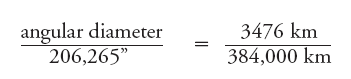 You can use this formula to find any one of these three quantities if you know the other two; in this case, you are interested in finding the angular diameter of the moon. The moon has a linear diameter of 3476 km and a distance from Earth of about 384,000 km. What is its angular diameter? The moon’s linear diameter and distance are both given in the same units, kilometers, so you can put them directly into the small-angle formula: