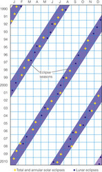 A CHINESE STORY tells of two astronomers, Hsi and Ho, who were too drunk to predict the solar eclipse of October 22, 2137 BC. Or perhaps they failed to conduct the proper ceremonies to scare away the dragon that, according to Chinese tradition, was snacking on the sun’s disk. When the emperor recovered from the terror of the eclipse, he had the two astronomers beheaded. Making exact eclipse predictions requires a computer and proper software, but some ancient astronomers could make educated guesses as to which full moons and which new moons might result in eclipses. There are three good reasons to reproduce their methods. First, it is an important chapter of the history of science. Second, it will illustrate how apparently complex phenomena can be analyzed in terms of cycles. Third, eclipse prediction will exercise your scientific imagination and help you visualize Earth, the moon, and the sun as objects moving through space. Conditions for an EclipseYou can predict eclipses by thinking about the motion of the sun and moon in the sky. Imagine that you can look up into the sky from your home on Earth and see the sun moving along the ecliptic and the moon moving along its orbit. The orbit of the moon is tipped a bit over 5° to the plane of Earth’s orbit, so you see the moon follow a path tipped by that angle to the ecliptic. Each month, the moon crosses the ecliptic at two points called nodes. It crosses at one node going southward, and two weeks later it crosses at the other node going northward. Eclipses can only occur when the sun is near one of the nodes of the moon’s orbit. Only then can the moon cross in front of the sun and produce a solar eclipse, as shown in Figure 3-13a. Most new moons pass too far north or too far south of the sun to cause an eclipse. A lunar eclipse doesn’t happen at every full moon because most full moons pass too far north or too far south of the ecliptic and miss Earth’s shadow. The moon can enter Earth’s shadow only when the shadow is near a node in the moon’s orbit, and that means the sun must be near the other node. You can see a lunar eclipse in Figure 3-13b. So there are two conditions for an eclipse: The sun must be crossing a node, and the moon must be crossing either the same node (solar eclipse) or the other node (lunar eclipse). That means, of course, that solar eclipses can occur only when the moon is new, and lunar eclipses can occur only when the moon is full. Now you know the ancient secret of predicting eclipses. An eclipse can occur only during a period called an eclipse season during which the sun is close to a node in the moon’s orbit. For solar eclipses, an eclipse season is about 32 days long. Any new moon during this period will produce a solar eclipse. For lunar eclipses, the eclipse season is a bit shorter, about 22 days. Any full moon in this period will encounter Earth’s shadow and be eclipsed. This makes eclipse prediction easy. All you have to do is keep track of where the moon crosses the ecliptic (where the nodes of its orbit are). The eclipse seasons are danger intervals for eclipses. Any new moon that occurs within 16 days of the day the sun crosses a node will produce a solar eclipse. Any full moon that occurs within 11 days of the sun’s crossing a node will produce a lunar eclipse. This system works fairly well, and ancient astronomers such as the Maya may have used such a system. You could have been a very successful ancient Mayan astronomer with what you know about eclipse seasons, but you can do even better if you change your point of view. The View from SpaceChange your point of view and imagine that you are looking at the orbits of Earth and the moon from a point far away in space. You would see the moon’s orbit as a small disk tipped at an angle to the larger disk of Earth’s orbit. As Earth orbits the sun, the moon’s orbit remains fixed in direction. The nodes of the moon’s orbit are the points where it passes through the plane of Earth’s orbit; an eclipse season occurs each time the line connecting these nodes, the line of nodes, points toward the sun. Look at Figure 3-14a and notice that the line of nodes does not point at the sun in the example at lower left, and no eclipses are possible. At lower right, the line of nodes points toward the sun, and the shadows produce eclipses. The shadows of Earth and moon, seen from space, are very long and thin, as shown in the lower part of Figure 3-14. It is easy for them to miss their mark at new moon or full moon and fail to produce an eclipse. Only during an eclipse season, when the line of nodes points toward the sun, do the long, skinny shadows produce eclipses. If you watched for years from your point of view in space, you would see the orbit of the moon precess like a hubcap spinning on the ground. This precession is caused mostly by the gravitational influence of the sun, and it makes the line of nodes rotate once every 18.6 years. People back on Earth see the nodes slipping westward along the ecliptic 19.4° per year. This means that, according to the calendar, the eclipse seasons begin about 19 days earlier every year (Figure 3-15). So the sun does not need a full year to go from a node all the way around the ecliptic and back to that same node. The node is slipping westward to meet the sun, and the sun will cross the node after only 346.6 days (an eclipse year). This means the eclipses gradually move around the year occurring about 19 days earlier each year. If you see an eclipse in late December one year, you will see eclipses in early December the next year, and so on. The cyclic pattern of eclipses shown in Figure 3-15 should give you another clue as to how to predict eclipses. Eclipses follow a pattern, and if you were an ancient astronomer and understood the pattern, you could predict eclipses without ever knowing what the moon was or how an orbit works. The Saros CycleAncient astronomers could predict eclipses in an approximate way