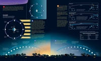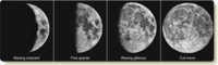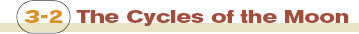 YOU HAVE NO DOUBT SEEN THE MOON in the sky and noticed its changing shapes. The cycle of the moon is one of the most obvious phenomena in the sky. The Motion of the MoonJust as the planets revolve counterclockwise around the sun, the moon revolves counterclockwise around Earth. Because the moon’s orbit is tipped a few degrees from the plane of Earth’s orbit, the moon wanders slightly north and south of the ecliptic, but it is always somewhere along the band of the zodiac. Next time you notice the moon, check on it a few hours later and you will be able to see it moving eastward along its orbit. The moon moves rapidly against the background of the constellations. If you watch the moon for just an hour, you can see it move eastward by slightly more than its angular diameter. In the previous chapter, you discovered that the moon is about 0.5° in angular diameter, so it moves eastward a bit more than 0.5° per hour. In 24 hours, it moves 13°. Each night when you look at the moon, you see it about 13° eastward of its location the night before. As it moves around Earth, the shape of the moon changes, and that cycle has been a natural timekeeper since the dawn of human civilization. The Cycle of PhasesThe changing shape of the moon as it orbits Earth is one of the most easily observed phenomena in astronomy. How often have you noticed the full moon rising dramatically or a thin crescent moon hanging in the evening sky? Study The Phases of the Moon on pages 30–31 and notice three important points: