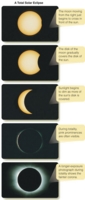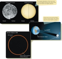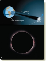 You can make a moon-phase dial from the middle diagram on page 30 by covering the lower half of the moon’s orbit with a sheet of paper, aligning the edge of the paper to pass through the word “Full” at the left and the word “New” at the right. Push a pin through the edge of the paper at Earth’s North Pole to make a pivot and, under the word “Full,” write on the paper “Eastern Horizon.” Under the word “New,” write “Western Horizon.” The paper now represents the horizon you see facing south. You can set your moon-phase dial for a given time by rotating the diagram behind the horizon-paper. For example, set the dial to sunset by turning the diagram until the human figure labeled “sunset” is standing at the top of the Earth globe; the dial shows, for example, that the full moon at sunset would be at the eastern horizon. The phases of the moon are dramatic, and they have attracted a number of peculiar ideas. You have probably heard a number of Common Misconceptions about the moon. Sometimes people are surprised to see the moon in the daytime sky, and they think something has gone wrong! No, the gibbous moon is often visible in the daytime, although quarter moons and especially crescent moons are harder to see when the sun is above the horizon. You may hear people mention “the dark side of the moon,” but you will be able to assure them that there is no dark side. Any location on the moon is sunlit for two weeks and is in darkness for two weeks as the moon rotates in sunlight. Also, you may have heard people say the moon is larger when it is on the horizon. Certainly the rising full moon looks big when you see it on the horizon, but that is an optical illusion. In reality, the moon is the same size on the horizon as when it is high overhead. Finally, you have probably heard one of the strangest misconceptions about the moon: that people tend to act up at full moon. Actual statistical studies of records from schools, prisons, hospitals, and so on show that it isn’t true. There are always a few people who misbehave; the moon has nothing to do with it. For billions of years, the man in the moon has looked down on Earth. Ancient civilizations saw the same cycle of phases that you see (Figure 3-3), and even the dinosaurs may have noticed the changing phases of the moon. Occasionally, however, the moon displays more complicated moods when it turns copper-red in a lunar eclipse. Lunar EclipsesAt full moon, the moon is opposite the sun in the sky, but, because the moon’s orbit is tipped a few degrees, it usually passes north or south of Earth’s shadow. If, however, it actually passes through the shadow, sunlight is cut off, and you see a lunar eclipse. Earth’s shadow consists of two parts (Figure 3-4). The umbra is the region of total shadow. If you were drifting in your spacesuit in the umbra of Earth’s shadow, the sun would be completely hidden behind Earth, and you would see no portion of the sun’s bright disk. If you drifted into the penumbra, however, you would see part of the sun peeking around the edge of Earth, so you would be in partial shadow. In the penumbra, sunlight is dimmed but not extinguished. Once or twice a year, the orbit of the moon carries it through the umbra of Earth’s shadow, and you see a total lunar eclipse (Figure 3-5). As you watch the moon in the sky, it first moves into the penumbra and dims slightly; the deeper it moves into the penumbra, the more it dims. In about an hour, the moon reaches the umbra, and you see the umbral shadow darken part of the moon. It takes about an hour for the moon to enter the umbra completely and become totally eclipsed. Totality, the period of total eclipse, may last as long as 1 hour 45 minutes, though the timing of the eclipse depends on where the moon crosses the shadow. When the moon is totally eclipsed, it does not disappear completely. Although it receives no direct sunlight, the moon in the umbra does receive some sunlight refracted (bent) through Earth’s atmosphere. If you were on the moon during totality, you would not see any part of the sun because it would be entirely hidden behind Earth. However, you would be able to see Earth’s atmosphere illuminated from behind by the sun. The red glow from this ring of “sunsets” and “sunrises” illuminates the moon during totality and makes it glow coppery red, as shown in Figure 3-5. If the moon passes a bit too far north or south, it may only partially enter the umbra, and you see a partial lunar eclipse. The part of the moon that remains outside the umbra in the penumbra receives some direct sunlight, and the glare is usually great enough to prevent your seeing the faint coppery glow of the part of the moon in the umbra. A penumbral lunar eclipse occurs when the moon passes through the penumbra but misses the umbra entirely. Because the penumbra is a region of partial shadow, the moon is only partially dimmed. A penumbral eclipse is not very impressive. Although there are usually no more than one or two lunar eclipses each year, it is not difficult to see one. You need only be on the dark side of Earth when the moon passes through Earth’s shadow. That is, the eclipse must occur between sunset and sunrise at your location. Table 3-1 will allow you to determine which upcoming total and partial lunar eclipses will be visible from your location. Solar EclipsesFrom Earth you can see a phenomenon that is not visible from most planets. It happens that the sun is 400 times larger than our moon and, on the average, 390 times farther away, so the sun and moon have nearly equal angular diameters, about 0.5°. (See Reasoning with Numbers 3-1.) That means that the moon is just the right size to cover the bright disk of the sun and cause a solar eclipse. If the moon covers the entire disk of the sun, you see a total eclipse. If it covers only part of the sun, you see a partial eclipse. Whether you see a total or partial eclipse depends on whe