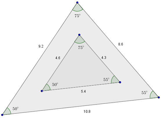Looking at the triangles in Figure 6.1 below, we can see that the corresponding angles are congruent. To determine whether the corresponding sides are proportional, we need to look at each of the three ratios and determine whether the ratios are the same. If we look at the side opposite the 75° angle in the big triangle and the side opposite the 75° angle in the small triangle, we see that the ratio is $\frac{10.8}{5.4}$ or $\frac{2}{1}$. If we do the same process for the other two sides, we see that the ratios are $\frac{8.6}{4.3}$ or $\frac{2}{1}$ and $\frac{9.2}{4.6}$ or $\frac{2}{1}$. Since we get the same ratio every time, these two triangles are similar.