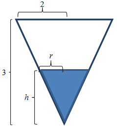 We have a pair of similar triangles so their side lengths are proportional. This gives us the following equation, $\frac{h}{3} = \frac{r}{2}$. Solving for r we have that $r = \frac{2}{3}h$. Now we substitute this equation into the volume formula and get $v = \frac{1}{3}\pi \left(\frac{2}{3}h\right)^2h = \frac{4}{27}\pi h^3$. Now we have the volume equation down to two variables. For lab, we will stop here and not solve the calculus problem.