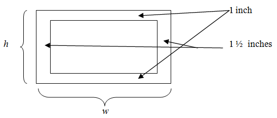 In the diagram, the height of the poster is represented by h and the width by w. The inside rectangle represents the printed area of the poster, which is the quantity that needs to be maximized so we need to find an equation that represents the area of this inside rectangle. Since we were given the margins for the poster, the printed area height should be 2 inches smaller than the height of the poster, $h - 2$.